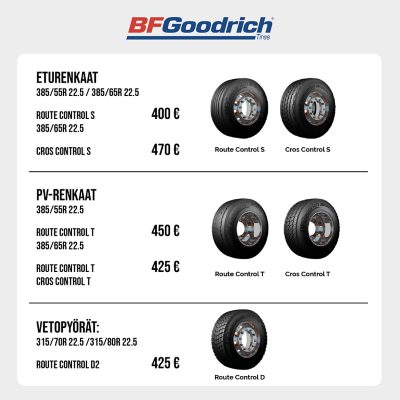 Katso alta Wetteri Powerin Kulumat kuntoon -rengaskampanjan tarjoukset uusille BF Goodrich -renkaille ja toimi nopeasti: tarjoushinnat ovat voimassa vain 15.5. saakka kaikissa Wetteri Power -toimipisteissä.